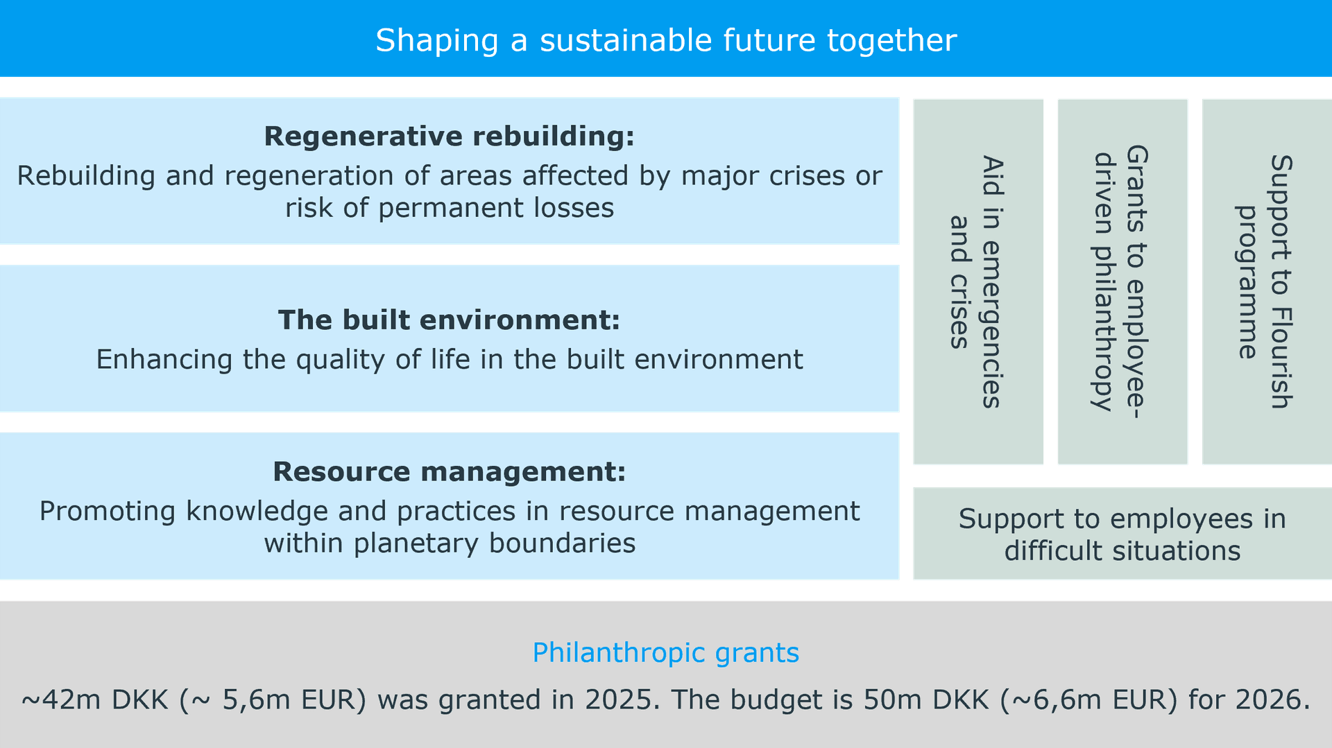 The legacy of our founders was one of caring for those in need and engaging the employees in Ramboll. In addition to our focused philanthropic missions, we operate within two global support areas, where our philanthropy will be driven by opportunities rather than defined missions. These areas are: